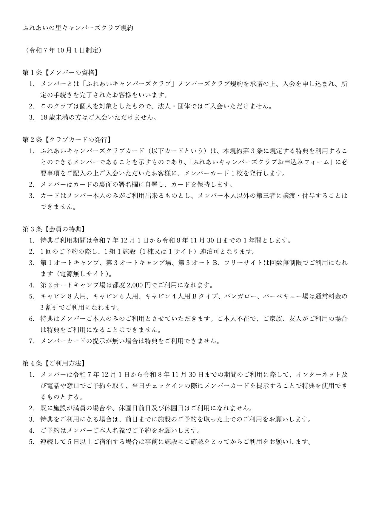クラブ特典:・テントサイト使い放題(電源付きサイトは都度2,000円)・他施設(キャビン、バンガロー、バーベキュー場)3割引き・その他クラブメンバー特典あり。